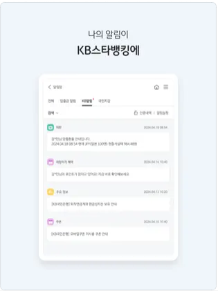 ■ 입출금 알림, 혜택 정보, 투자 정보 등 필요한 실시간 ‘알림’을 KB스타뱅킹에서 받아보세요.